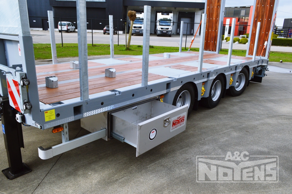 Met deze dieplader aanhanger kunnen zowel containers, goederen als machines getransporteerd worden. Deze kunnen op een veilige en correcte manier verankerd worden op de laadvloer met behulp van uitneembare stippen, containergeleidingen, versterkt kopschot en vloerankers die allen getest zijn voor ladingzekering.