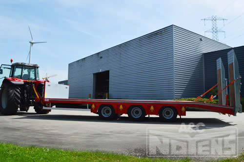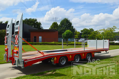 Een verzonken gedeelte in de laadvloer geeft de mogelijkheid voor de arm van de kraan dieper te positioneren zodat de volledige hoogte onder 4m blijft. Voldoende verankeringsogen zorgen ervoor dat machines op een correcte en veilige wijze verankerd worden. Met de standaard voorziene luchtvering heeft deze tridem as aanhangwagen een goede wegligging en rijcomfort.
