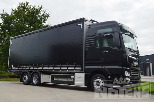 Deze gesloten schuifzeilopbouw op MAN vrachtwagen is uitgerust met standaard schuifzeilen met tussenrongen en bacheplanken. Het dak is hydraulisch hefbaar zowel voor de linkerzijde als de rechterzijde zodat hoge ladingen makkelijk zijdelings kunnen worden geladen. Een verlaagde vangmuilkoppeling met afstandsbediening maakt het mogelijk om een aanhangwagen te koppelen voor volumetransport.