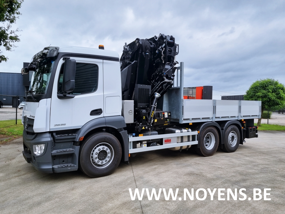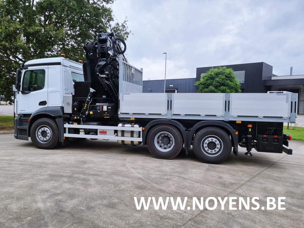 Deze Mercedes vrachtwagen met laadkraan werd voorzien van open laadbak met zijborden.